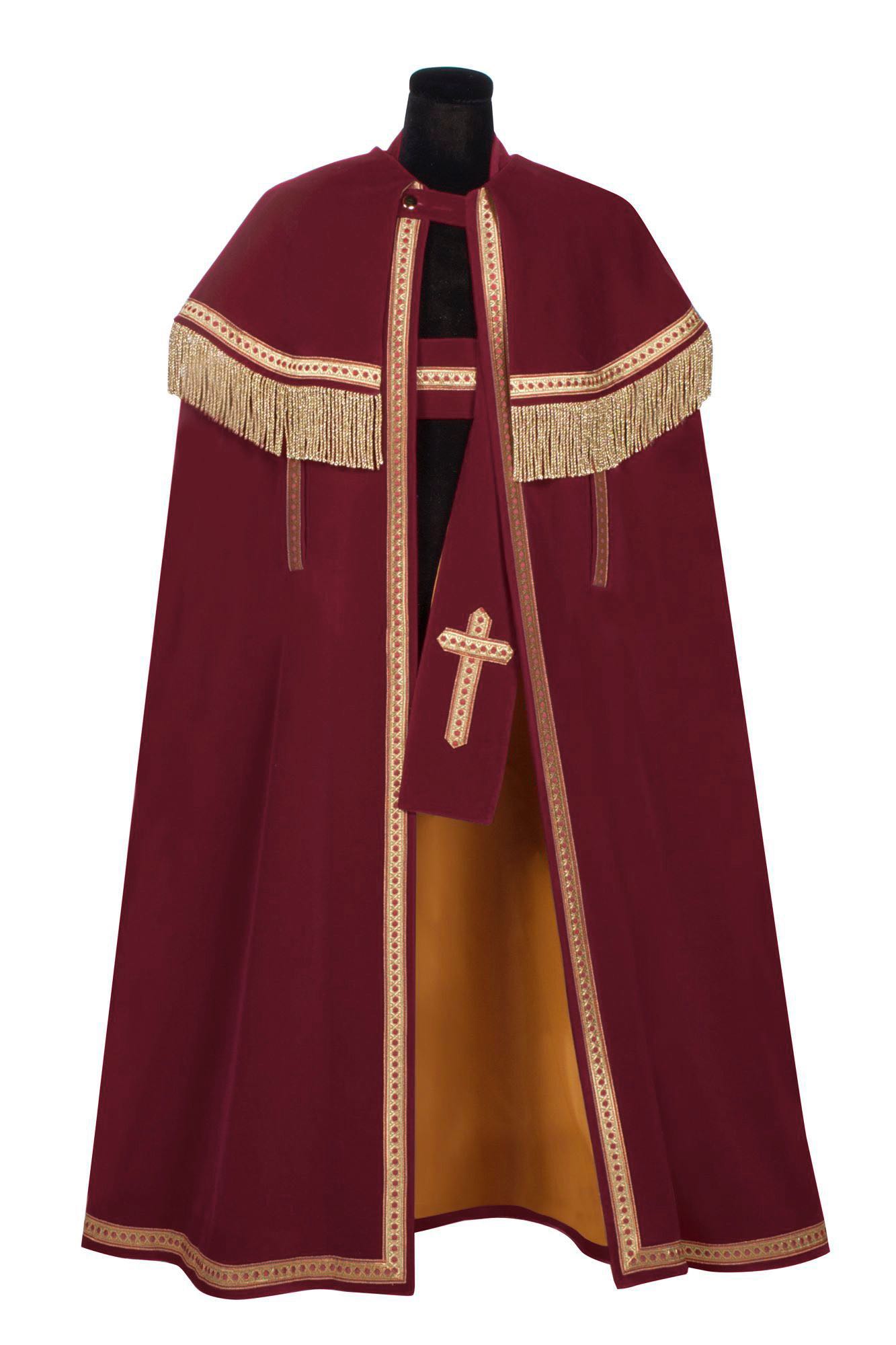 Wijde Bram mantel, prachtige wijde mantel met origineel Bram galon en mooie lange franje. Deze mantel is gemaakt van een top kwaliteit Niedeck fluweel en gevoerd met een gouden satijnen voering. |