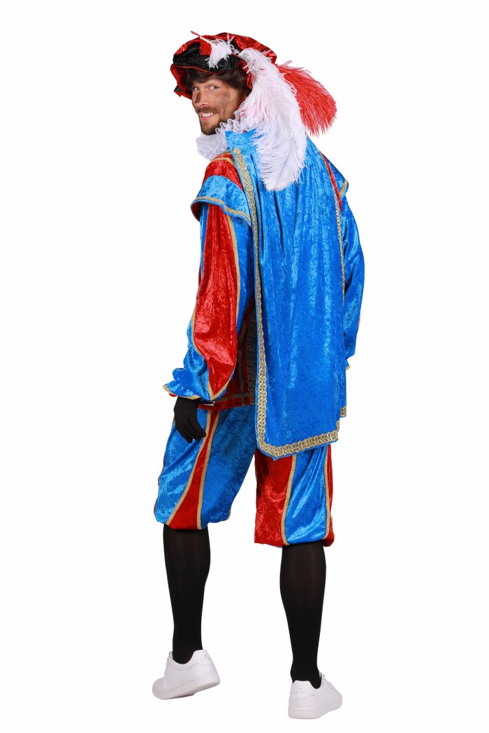 Dit pietenkostuum met cape in een velours de panne kwaliteit is zeer rijk bestikt met goudgalon, jas met afneembare cape, driekwart lange broek met elastieke taille en een hele mooie baret. |