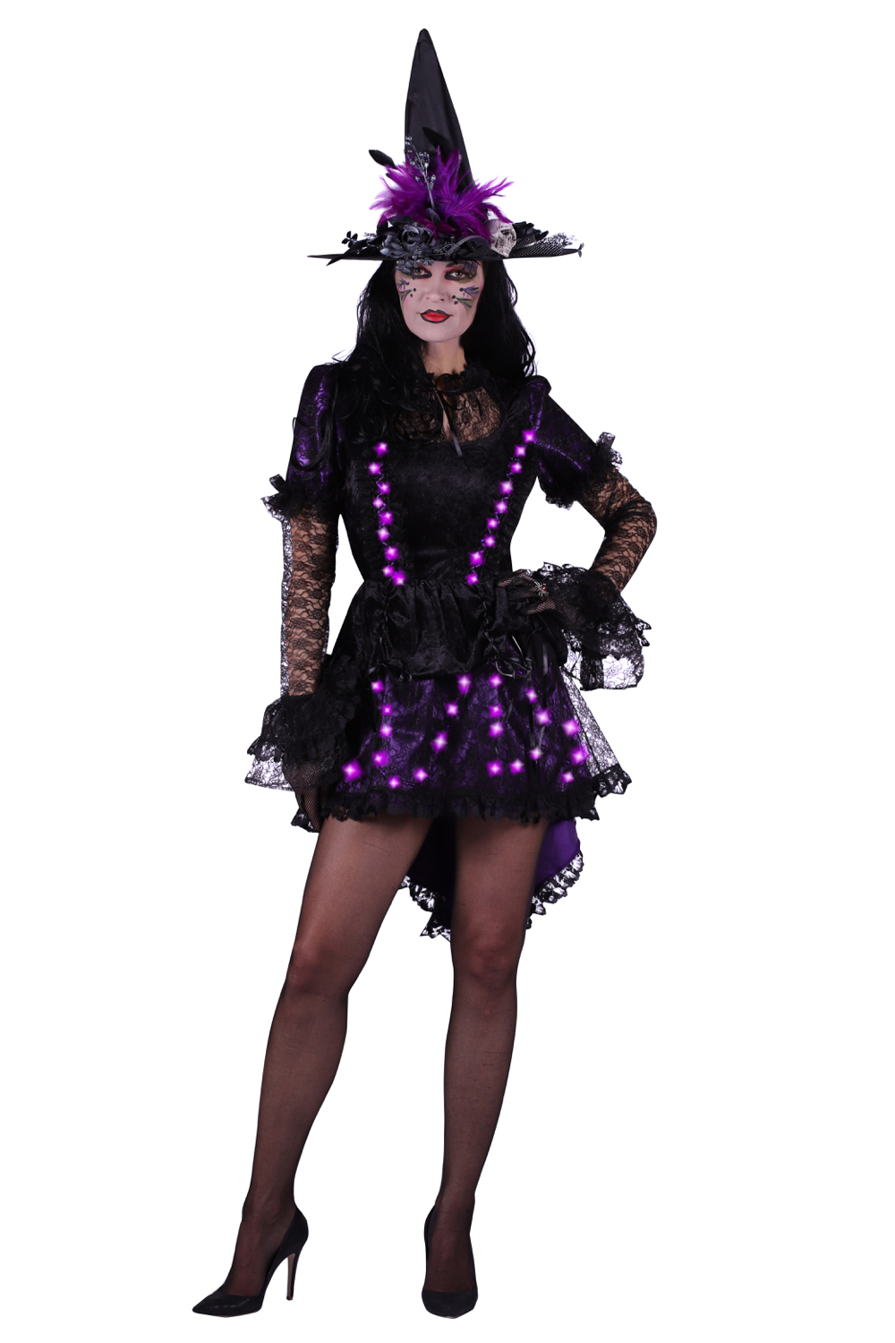Heksenjurk is gemaakt in velours de panne met paarse satijnen details de mouwen en decoletè/kraag in kantstof in de dalon zit LED verlichting verwerkt die word gevoed door 3AA batterijen in een afkoppelbaar kastje. |