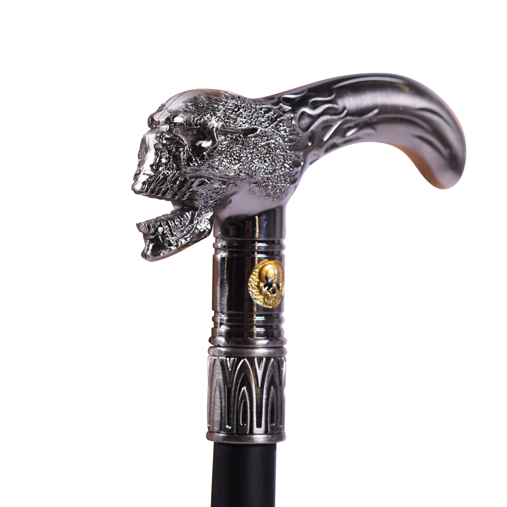 Deze prachtige wandelstok heeft een houten stok met een rubberen anti slip dop aan de onderkant, de metalen handgreep heeft een doodskop aan de voorkant.