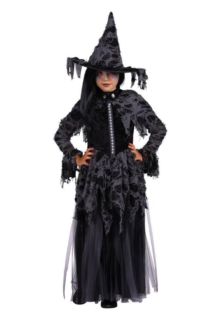 jurk in een spooky "used look" kwaliteit stof, voorpand is versiert met een rij kralen, word achter gesloten met een rits , hoed in dezelfde stof als jurk word meegeleverd. |